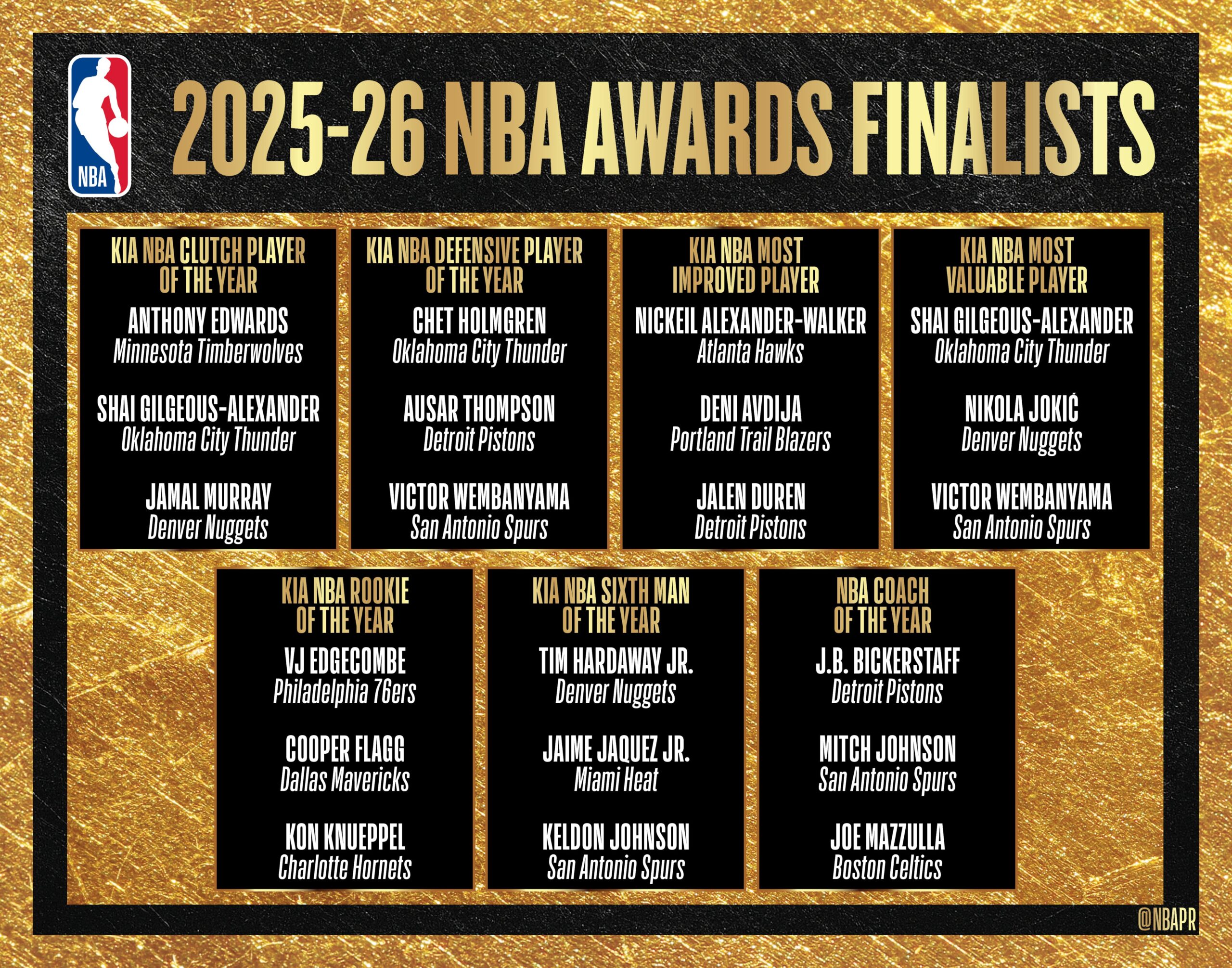 Uz labākā aizsardzības spēlētāja balvu pretendē Čets Holmgrens no “Thunder”, Osars Tompsons no Detroitas “Pistons” un Vembanjama, uz progresējušākā spēlētāja titulu – Nikeils Aleksandrs-Volkers no Atlantas “Hawks”, Deni Avdija no Portlendas “Trail Blazers” un Džeilens Durens no “Pistons”, bet uz labākā rezervista titulu – Tims Hārdevejs jaunākais no “Nuggets”, Haime Hakess no Maiami “Heat” un Keldons Džonsons no “Spurs”.