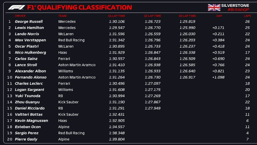 Rasels apli veica minūtē un 25,819 sekundēs, bet Hamiltons bija otrais ar laiku minūte un 25,990 sekundes, sagādājot britu pilotiem pirmo dubultuzvaru Lielbritānijas “Lielās balvas” izcīņā kopš 1968.gada. Arī trešo vietu ieņēma mājinieks “McLaren” pilots Lendo Noriss, kurš trasi trešajā kvalifikācijas kārtā veica minūtē un 26,030 sekundēs.