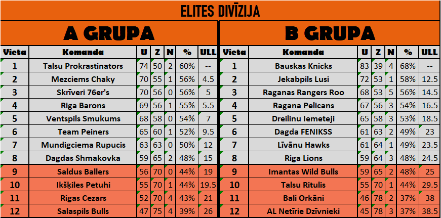 Zepčika “Karaļus” kronējām jau labu laiku atpakaļ, tāpēc par grupas līderi šajā apskatā ne vārda. Viņš var gatavoties “play-off”. Arī tabulas lejasgalā īsti nav par ko vērpt intrigas, jo tur viss ir ar melnu uz balta uzrakstīts – 9. – 12. vietu ieņems Vegasas “Bandīti”, Ozolnieku “Plūmītes”, Limbažu “Šakāļi” un Teikas “Burvji”. Šajā grupā būs interesanti pavērot, kura komanda ieņems 2. un 3. vietu, kā arī kā sarindosies komandas no 4. līdz 7. vietai. Starp šīm komandām ir tikai trīs uzvarētās kategorijas. Skaidri zināms ir tas, ka “Karaļi”, kas uzvarēs regulāro, izslēgšanas turnīra pirmajā kārtā tiksies ar Staiceles “Burlakiem”. Kungi jau var zīmēt uzvaru shēmas.