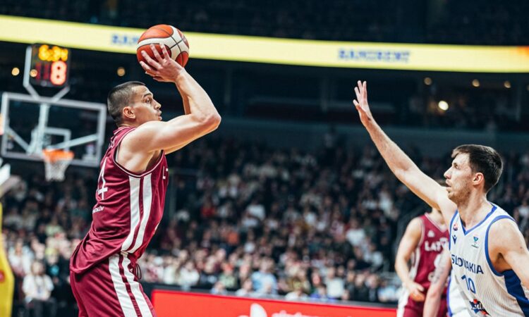 Latvijas vīriešu basketbola izlase svētdien “Arēnā Rīga” 2025.gada Eiropas čempionāta kvalifikācijas otrajā spēlē ar rezultātu 64:52 (15:10, 16:17, 14:11, 19:14) pārspēja Slovākijas valstsvienību.
