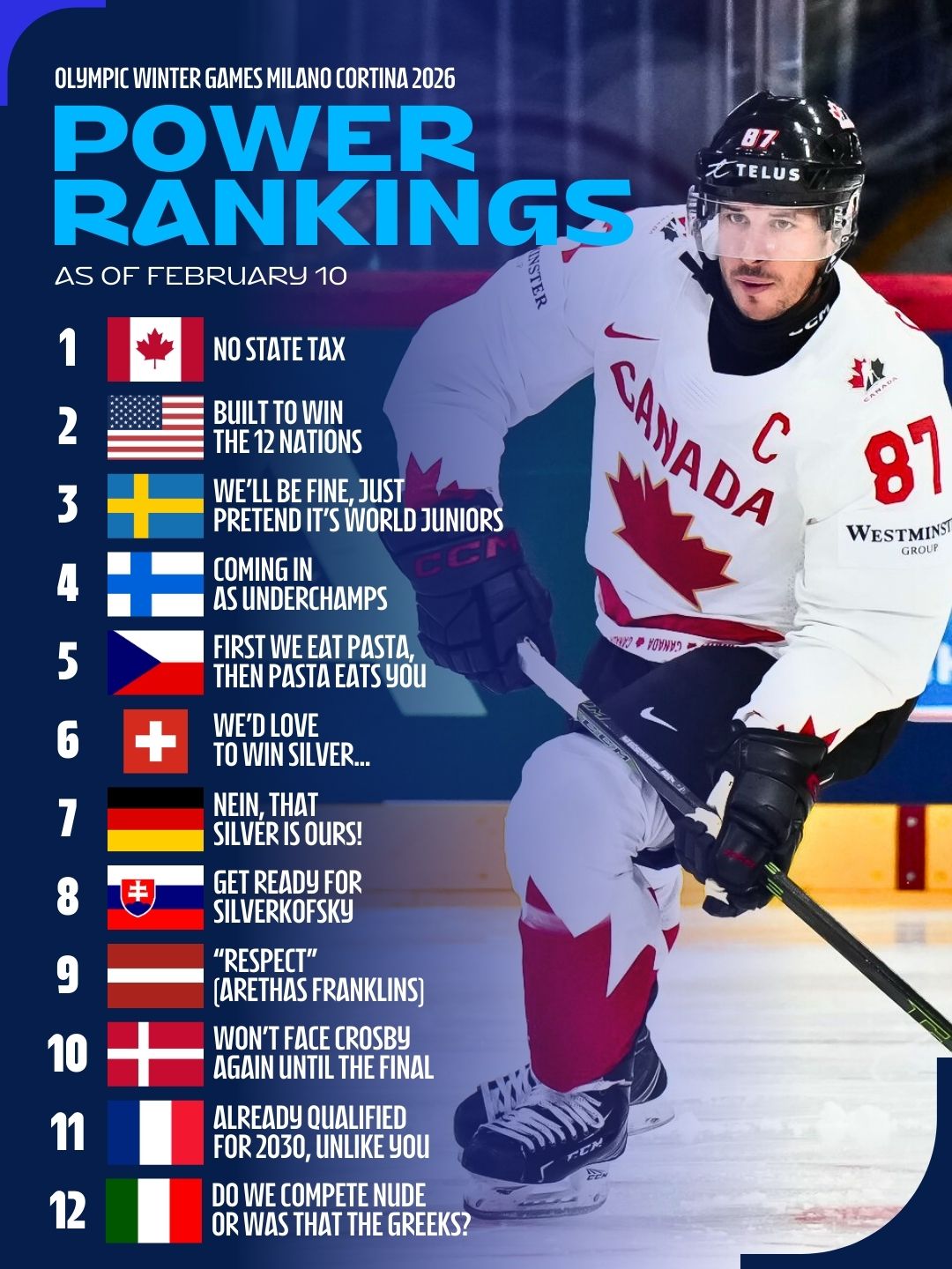 Starptautiskā hokeja federācija (IIHF) publicējusi savu spēka rangu pirms gaidāmā Milānas-Kortīnas olimpisko spēļu turnīra.