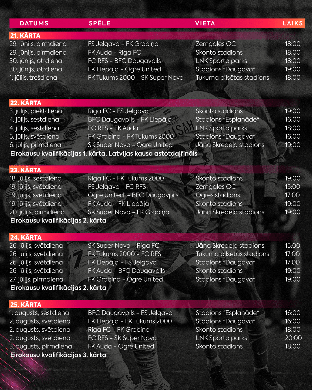 Tāpat kā tas bijis arī iepriekšējās sezonās, kalendāra veidošanā domājām par klubiem, kuri vasarā pārstāv Latviju Eirokausos, lai nodrošinātu viņiem iespējami ērtāku sacensību grafiku jūlijā un augustā. Klubu sekmīgs starts Eiropas kausos ir priekšnosacījums Latvijas reitinga izaugsmei, kas ietekmē arī solidaritātes maksājumu apjomu, kā arī futbola popularitāti kopumā.”