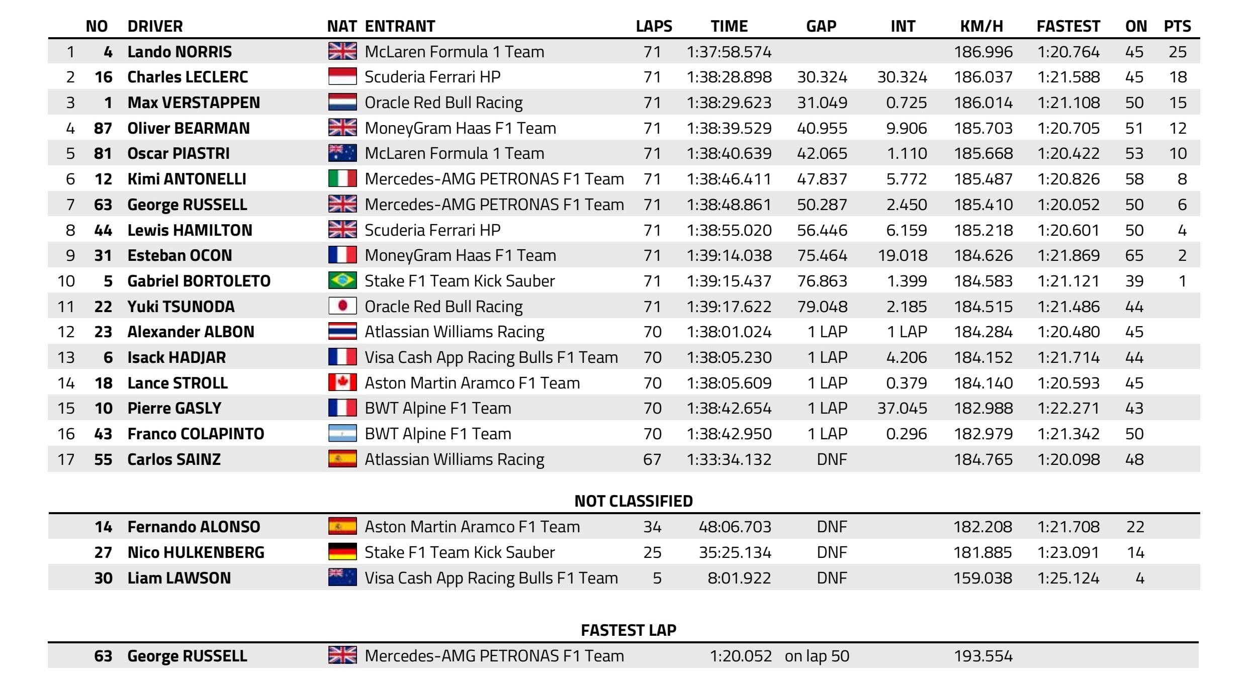 Aiz Piastri palika abi “Mercedes” piloti Kimi Antonelli un Džordžs Rasels. Ilgstoši riņķojis aiz abām sudraba bultām, Piastri tika garām Antonelli otro boksu laikā, bet Raselu viņš apsteidza 60. apļa sākumā.