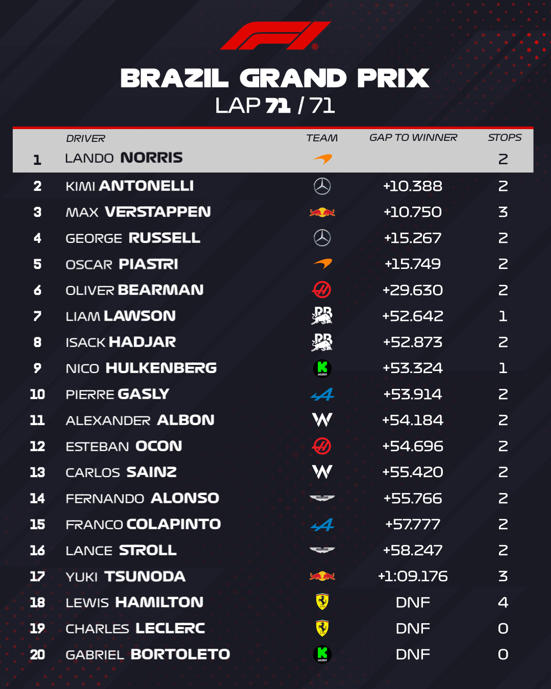 Šovakar Pirmās formulas (F-1) sezonas 21. posmā Brazīlijā uzvaru izcīnīja čempionāta līderis Lando Noriss, kopvērtējumā palielinot pārsvaru pār savu komandas biedru Oskaru Piastri, kurš Sanpaulu trasē samierinājās ar piekto pozīciju.