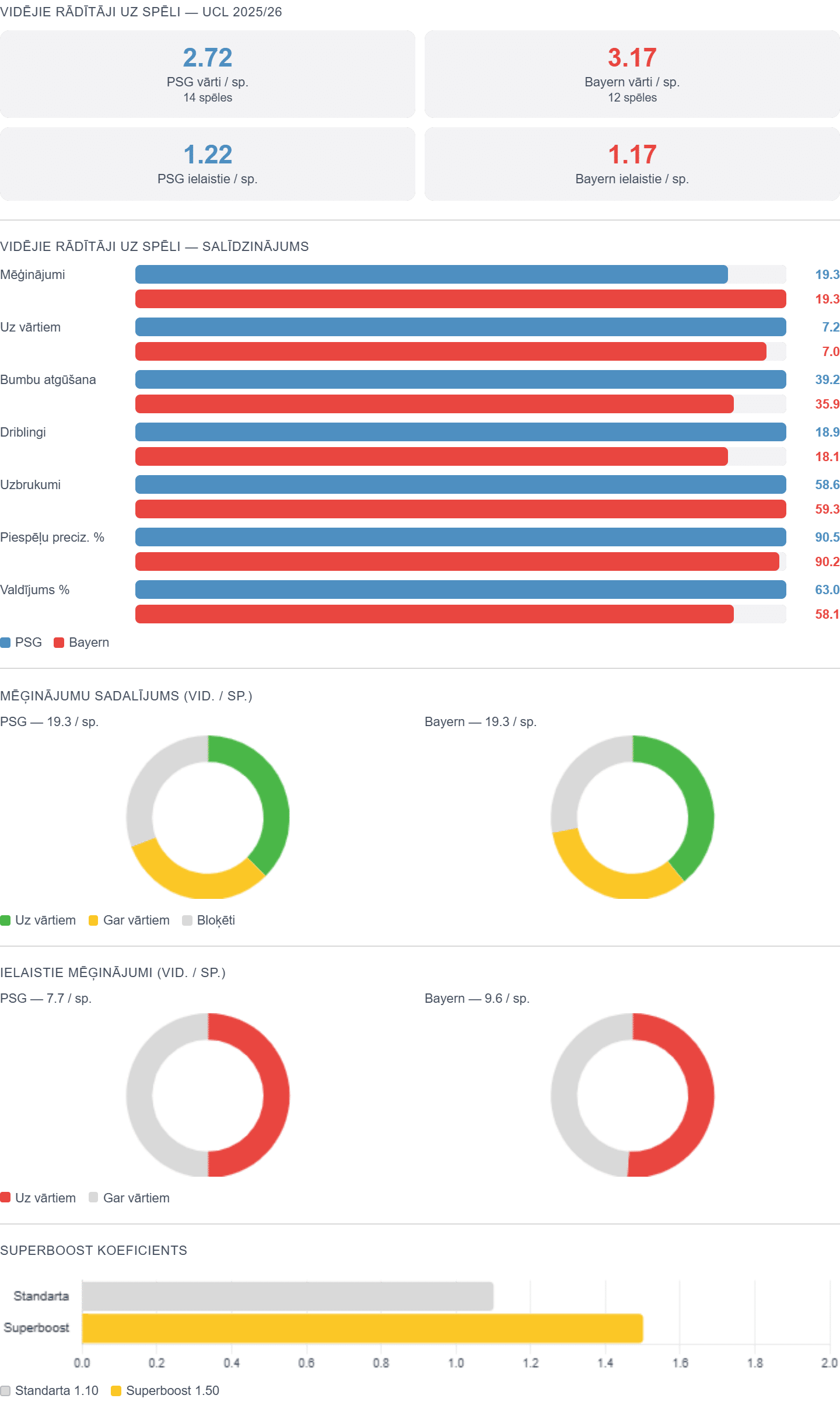 PSG un Minhenes “Bayern” šosezon Čempionu līgā demonstrē ļoti rezultatīvu futbolu, kas atspoguļojas arī galvenajos rādītājos. Parīzes klubs vidēji gūst 2.72 vārtus spēlē, kamēr Vācijas čempioni izceļas ar vēl augstāku rezultativitāti – 3.17 vārti spēlē. Aizsardzībā abas komandas ir līdzīgā līmenī – PSG ielaiž 1.22, bet “Bayern” 1.17 vārtus.