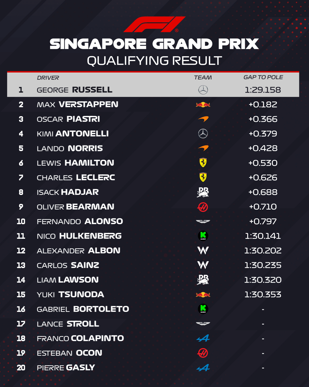 Otro starta rindu rezervēja čempionāta līderis Oskars Piastri (“McLaren”) un Rasela komandas biedrs Kimi Antonelli, bet tikai ar piekto vietu samierinājās kopvērtējuma vicelīderis Lando Noriss (“McLaren”). Tālāk sekoja abi “Ferrari” piloti Lūiss Hamiltons un Šarls Leklērs, “Racing Bulls” braucējs Isaks Hadžars, bet TOP 10 noslēdza Olivers Bērmans (“Haas”) un Fernando Alonso (“Aston Martin”).
