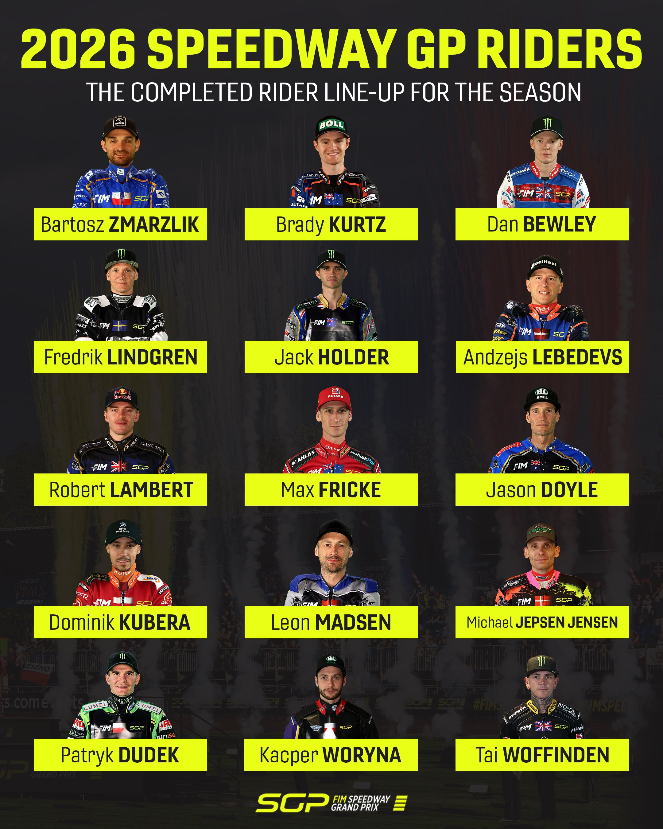 Starptautiskā Motosporta federācija (FIM) paziņojusi visus 15 spīdvejistus un piecus rezervistus, kuri startēs nākamā gada pasaules čempionātā jeb “Grand Prix”. Trešo gadu pēc kārtas “Grand Prix” startēs arī Latvijas labākais spīdvejists Andžejs Ļebedevs.
