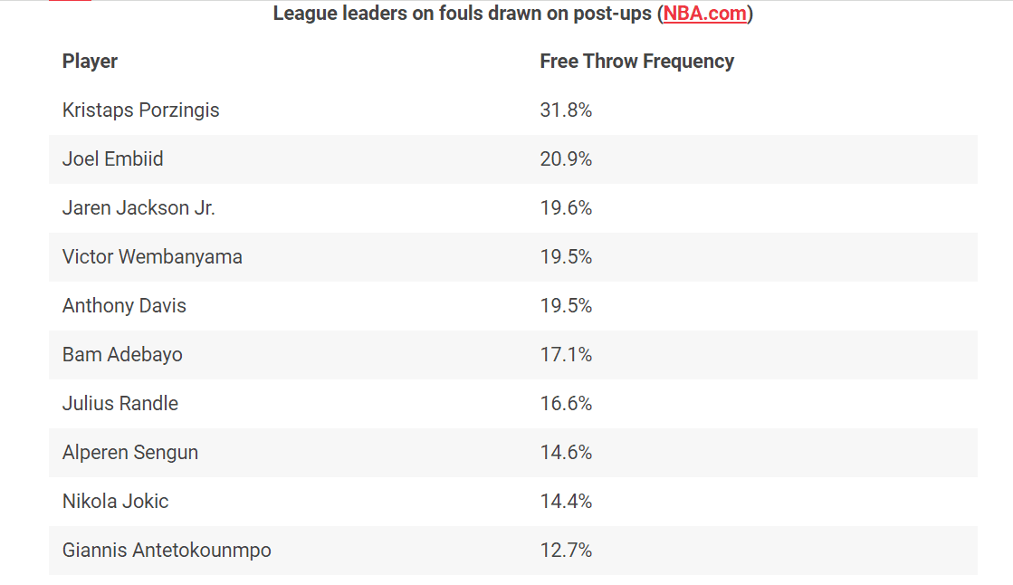 Vēl jāpiemin, ka Porziņģis ir līderis rādītājā, kas norāda, cik bieži spēlētājs “postā” izprovocē pretinieku uz noteikumu pārkāpumu, tiekot pie iespējas izpildīt soda metienus.